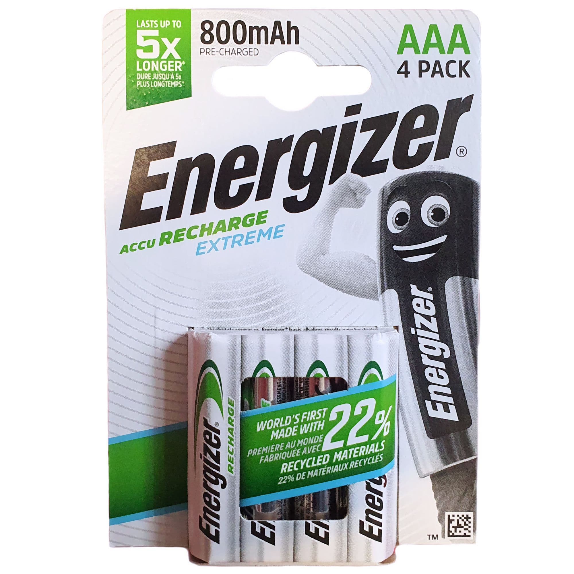 Energizer AAA rechargeable batteries from their Extreme range. Fully charged and ready to use with a 800mAh capacity these batteries are suitable for cordless phones, hair trimmers, remote controls and many other household devices. Ideal replacements for any rechargeable AAA battery in the 750 mAh to 850 mAh range.