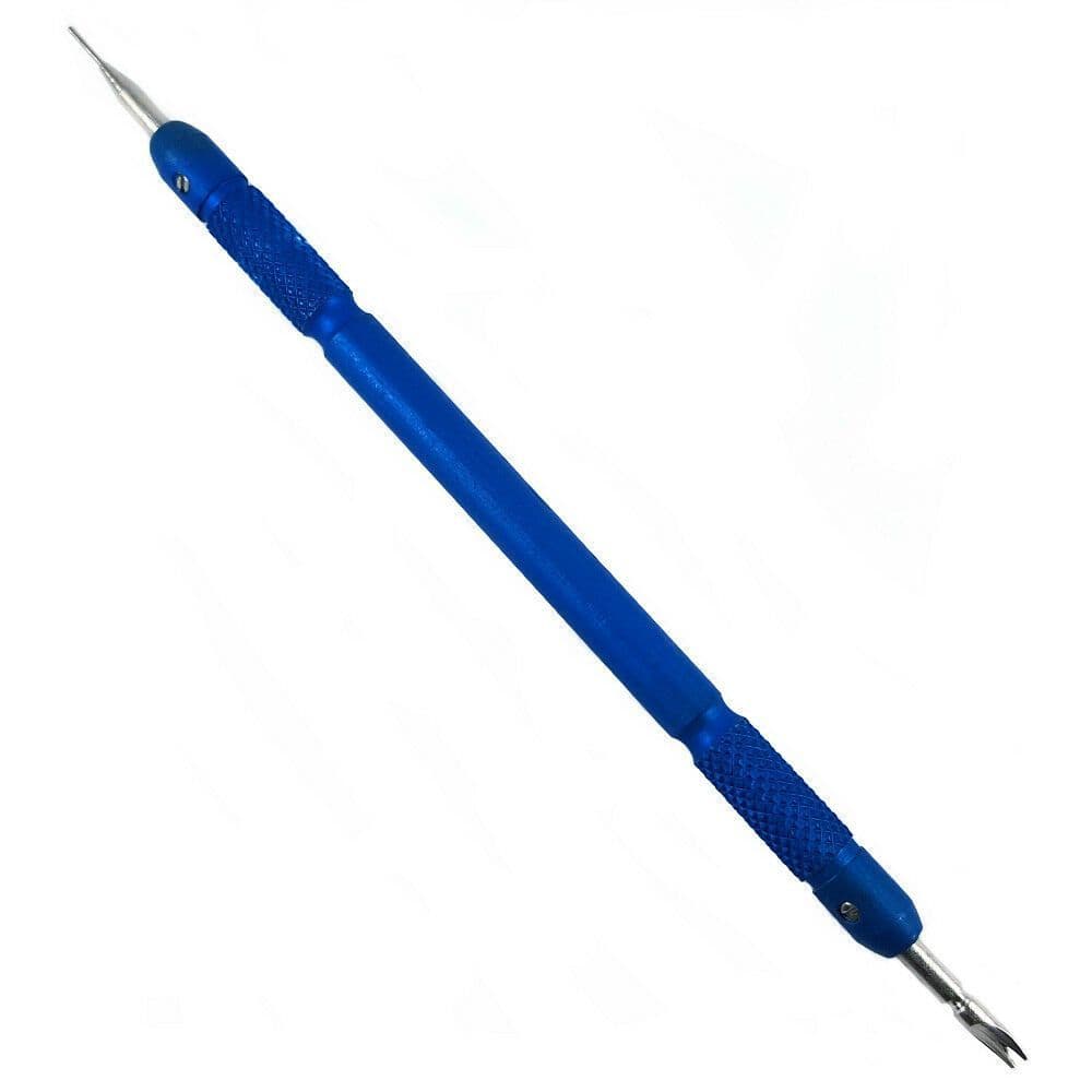 Deluxe anodized aluminium spring bar removing tool with a sturdy steel 2.5mm wide fork tip and 0.8mm diameter pin. Both tips unscrew to enable you to change tips should you need to. A quality slimline, lightweight tool with comfortable and smooth serrated grips for easy use and precise control.